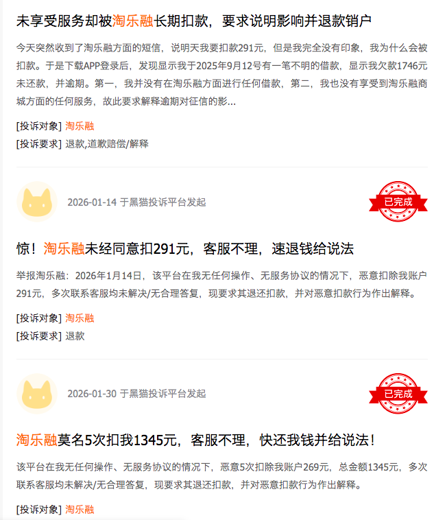 “在我无任何操作、无服务协议的情况下,恶意扣除我账户291元。”2026年1月,一位网友在黑猫投诉平台上的经历,引发了公众对“淘乐融”平台运营模式的关注。
