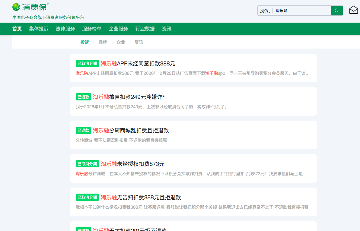 这样的投诉并非孤例。截至发稿前,在黑猫投诉平台中,有关“淘乐融”的投诉检索达128条,关键词聚焦“自动扣费”“霸王条款”等,时间多集中于2025年底至今。