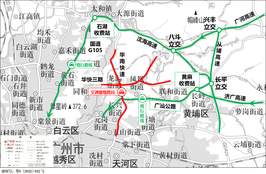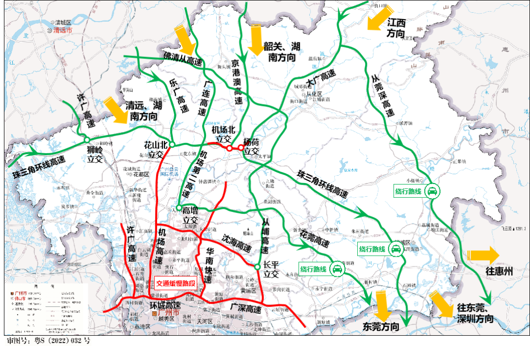 返程高峰期间,北部通道的机场高速(平沙立交—黄石立交段)、机场第二高速(高增立交—北村立交路段)、乐广高速(银盏隧道)、华南快速(春岗立交—龙洞收费站)、大广高速(米埗站—温泉站、机场北立交—山前段)、北二环高速(长平立交—火村立交段)等路段车流聚集;
