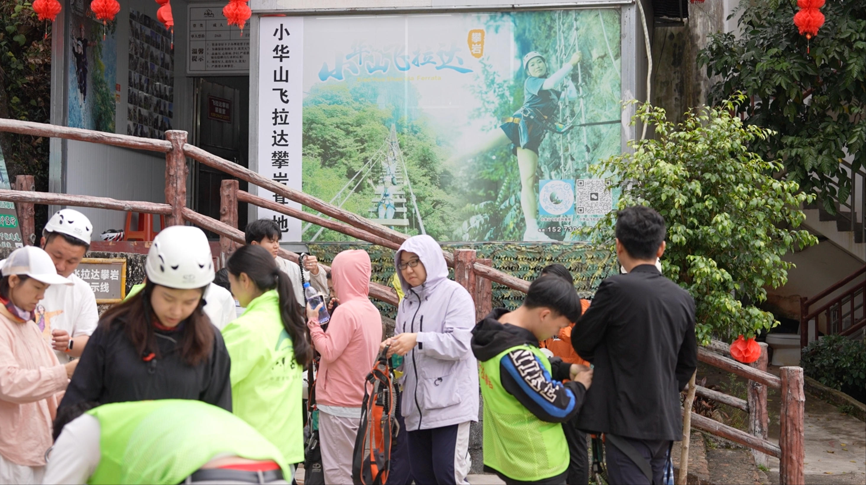 清远市浸潭镇六甲洞村的景区内,游客们进行热身活动,准备体验景区内的攀岩项目。