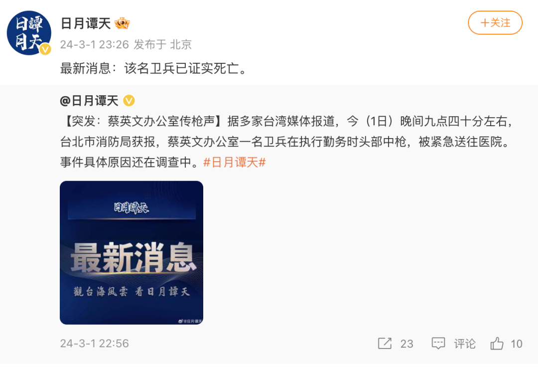 对此,台“宪兵指挥部”1日晚称,“宪兵211营”古姓上兵,21时36分执勤卫哨时,持枪自我伤害,已转送中山马偕医院急救,经抢救后22时25分医生宣告死亡。“宪兵指挥部”称,已派人员协助家属处理相关事宜,后续并配合检调厘清肇因。