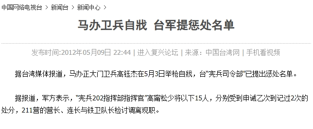 值得一提的是,2012年5月,台湾地区领导人办公室也曾发生过一起卫兵自杀事件。卫兵高钰杰在站夜哨时举枪自杀。报道指出,“宪兵211营”负责台湾地区领导人安保工作,任务特殊,人员选拔和训练较为严格,成员多有较大的心理压力。另外,由于近年台防务部门普遍面临人手不足问题,卫哨勤务更显繁重。