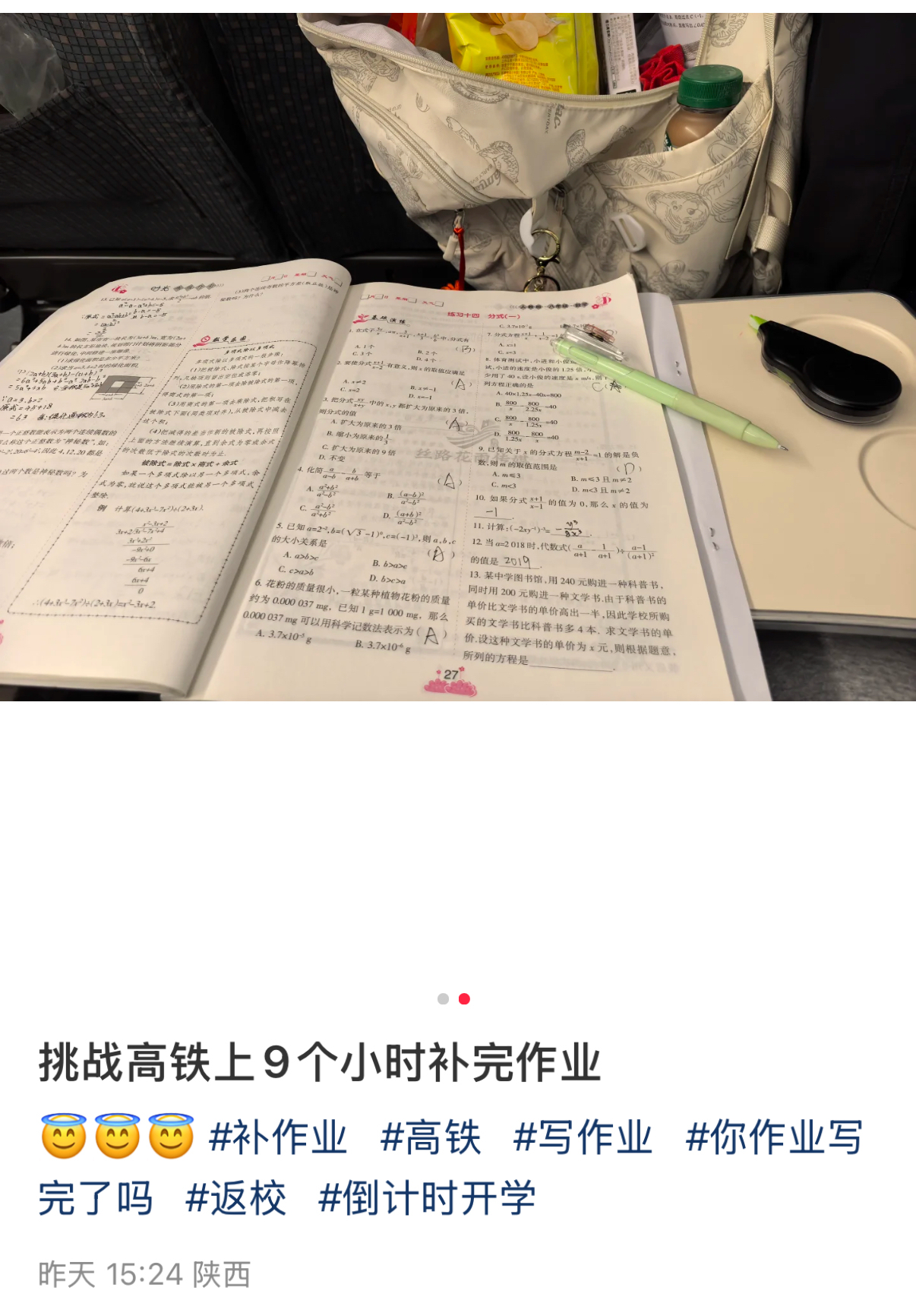 社交平台上就有学生党用户发文表示,自己成功挑战了在高铁上用9个小时时间补完作业,主打一个极其精准的时间管理。