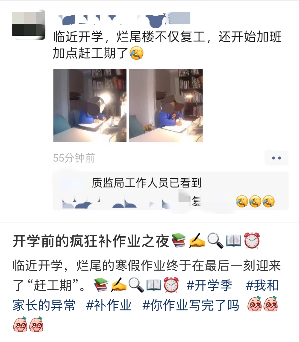 还有心态又稳又好的家长调侃这项补作业的工作为“烂尾楼复工”,而且着重强调了一下,这是“加班加点赶工期”。