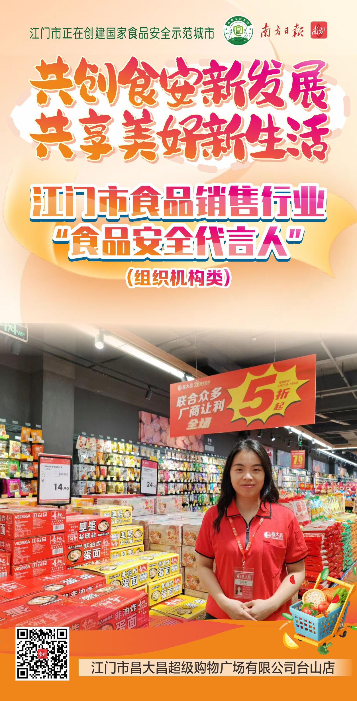 在征集过程中,全市食品销售行业有关单位及从业人员积极分享食品安全心得,鼓励和带动全市食品销售行业尚俭崇信尽责,制止食品浪费,同心守护食品安全,共同为江门市食品安全代言。经过严格的审核与筛选,最终选出44位“候选代言人”参加点赞活动。点赞活动累计吸引超过17万人次读者积极参与,最终根据人气评选出代言人。其中,江门市昌大昌超级购物广场有限公司台山店上榜。