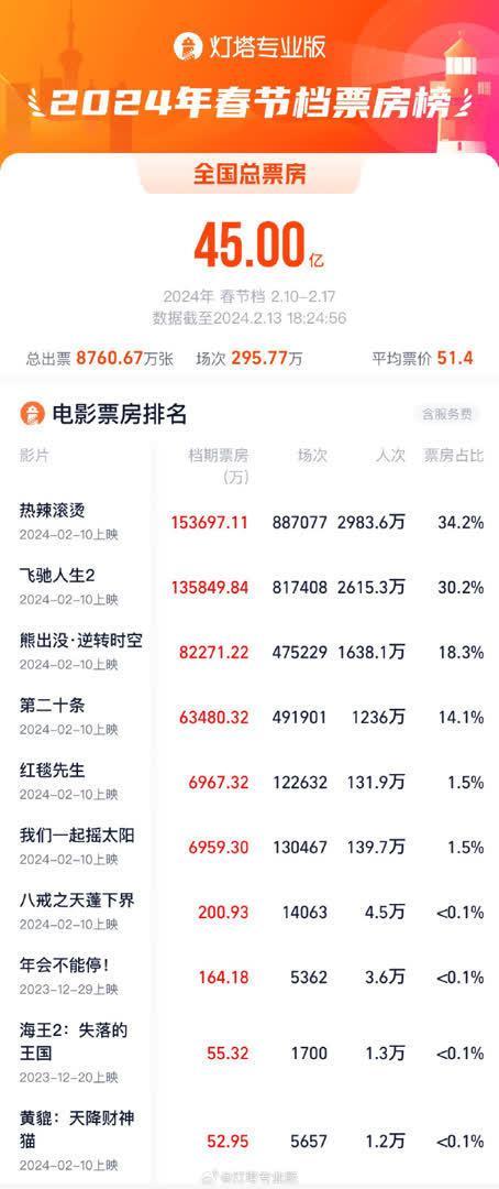 据灯塔专业版数据,截至2月13日18时24分,2024年春节档(2月10日—2月17日)档期总票房(含预售)突破45亿!《热辣滚烫》《飞驰人生2》《熊出没·逆转时空》暂列档期票房前三位。