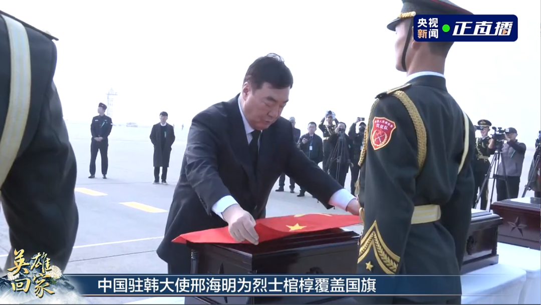 11月23日,在韩国仁川国际机场,中国人民解放军礼兵(左)从韩方接过中国人民志愿军烈士棺椁。新华社记者 曹灿 摄