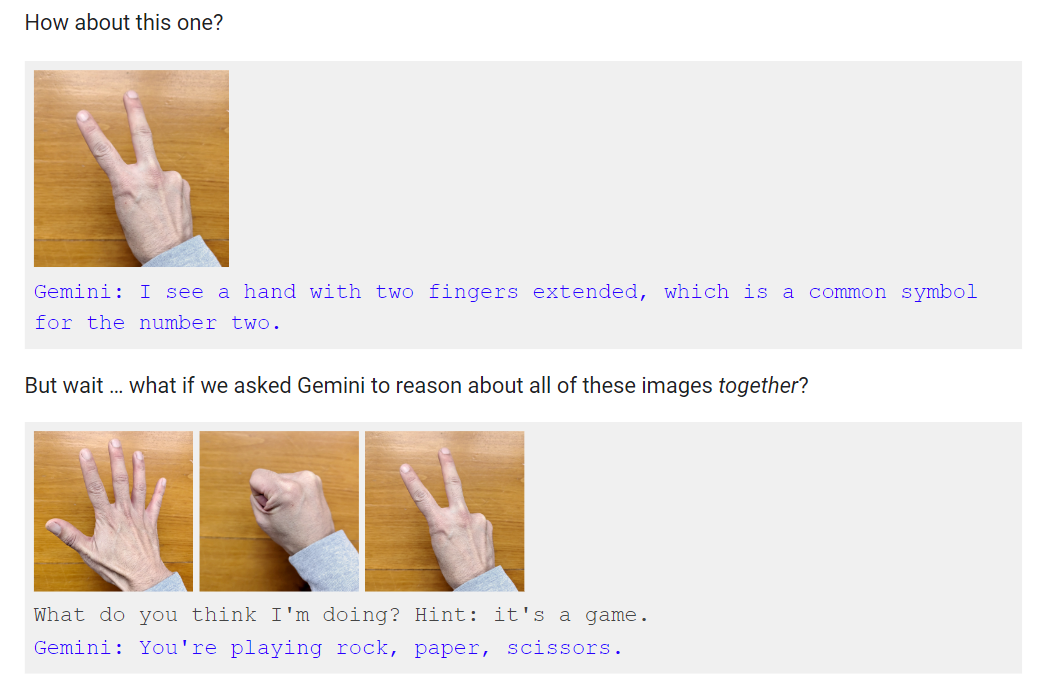 例如,在文章中,谷歌承认,不同于视频中对于猜拳手势的快速反应,只有在向Gemini同时展示这三个手势并提示其这是游戏时,Gemini才会得出猜拳游戏的结论。官网截图