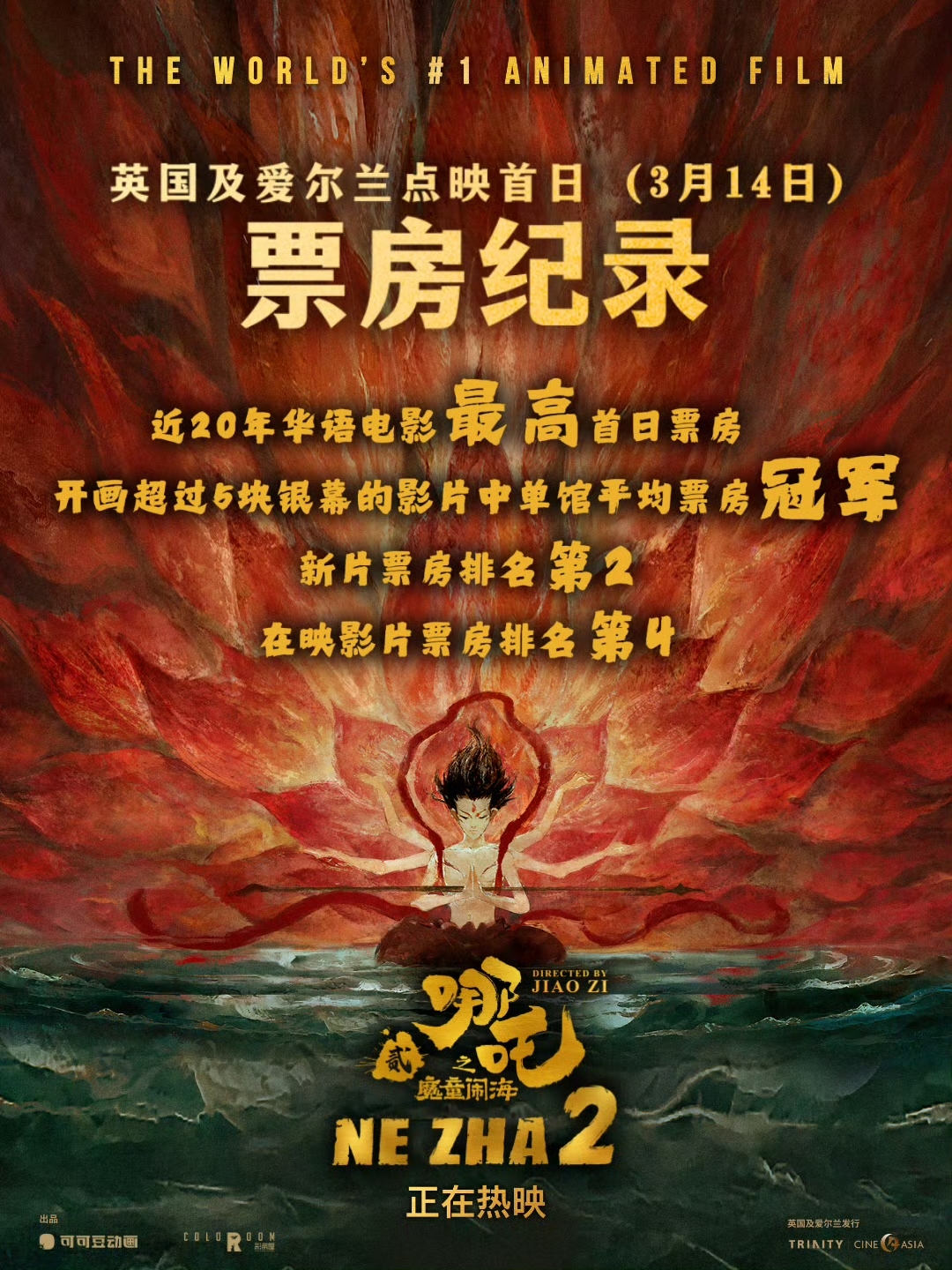 此外,《哪吒2》的出海之旅仍在继续。该片近日在英国、爱尔兰,日本等地正式上映,英国及爱尔兰点映首日(3月14日)即突破当地近20年华语电影最高首日票房纪录;日本上映首周末,在映影片场均票房、上座率均获第一。