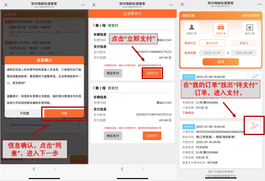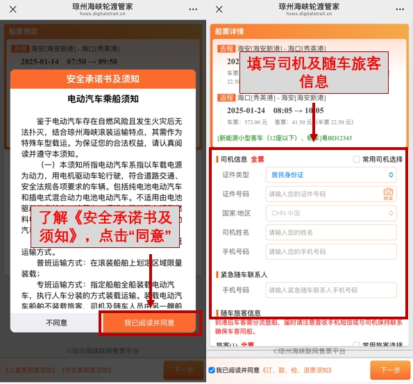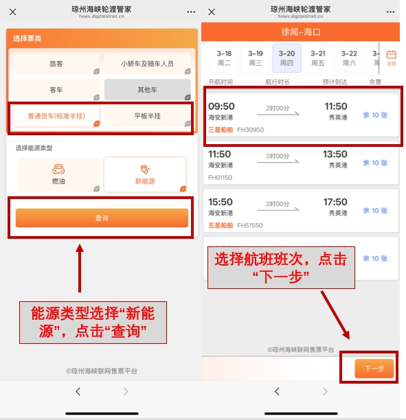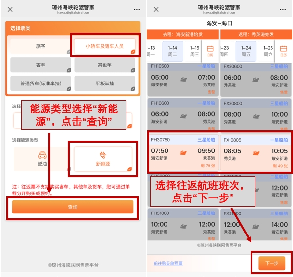 所有计划进岛的新能源车辆,必须提前通过“徐闻港”或“琼州海峡轮渡管家”微信公众号进行预约购票。预约成功后,请务必提前2-3个小时到达港口。未提前预约的车辆,将无法进入港区。