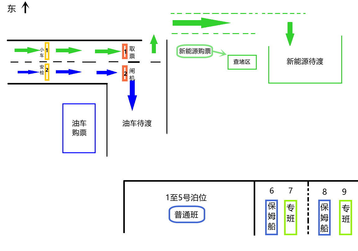 4.车辆待渡:车辆与随车人员汇合后,开到查堵区旁的新能源专用待渡场待渡。如专班船舶已在泊位,则直接开到船头待渡。
