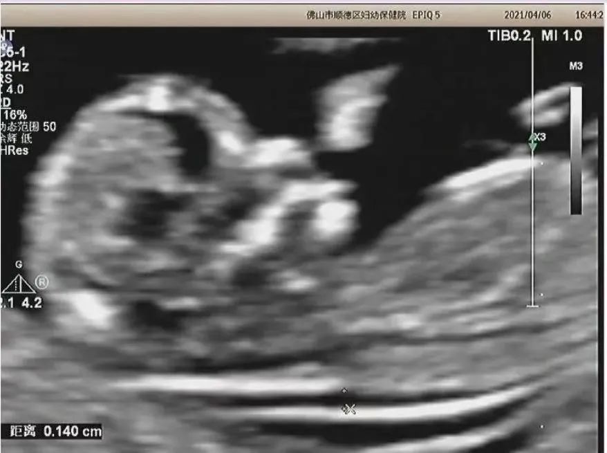 超声筛查:NT(颈项透明层)厚度检测可筛查80%的21-三体胎儿。