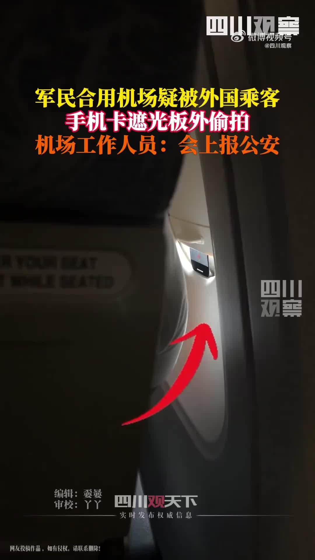 6月12日,义乌飞往北京一航班上,疑似一名外国乘客将手机卡在遮光板外偷拍军民合用机场,后排乘客警觉举报。义乌机场工作人员表示:军民合用机场不允许在跑道上拍照,会上报公安。详情>>