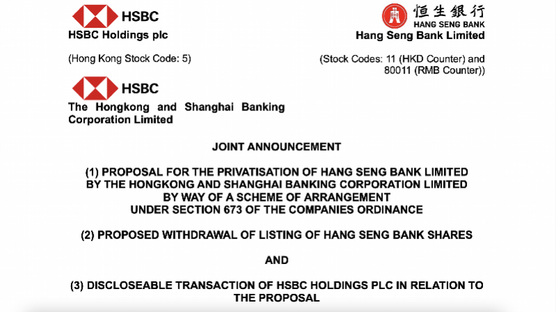 10月9日上午,汇丰控股(股份代号:0005.HK,以下简称“汇丰”)与恒生银行(股份代号:0011.HK,以下简称“恒生”)在港交所发布联合公告,汇丰的全资附属公司“汇丰亚太”已根据香港《公司条例》第673条提出以协议安排方式将恒生银行有限公司私有化的建议,同时建议撤销恒生银行股份的上市地位。