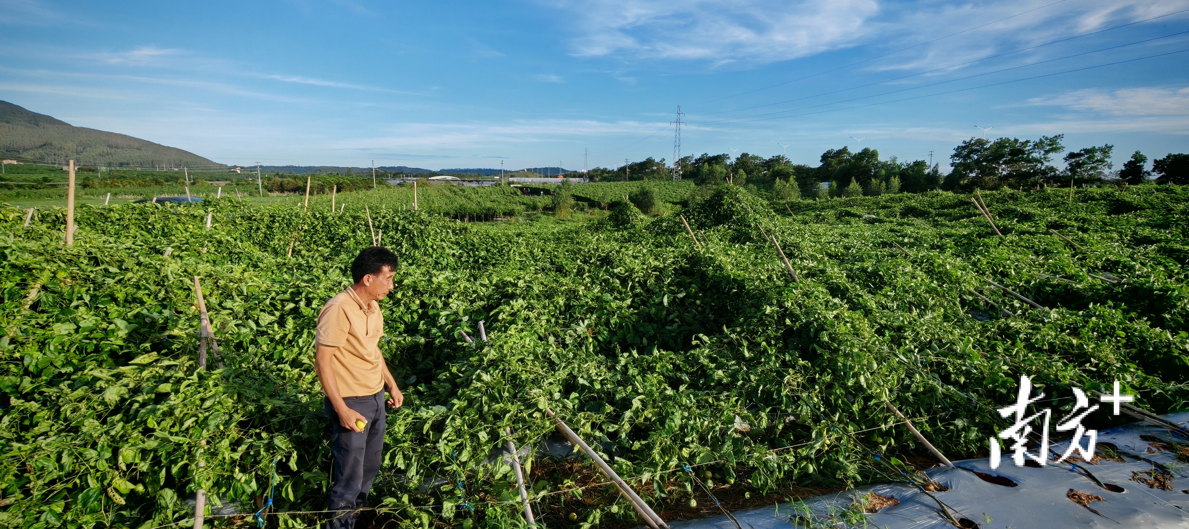 陈迪在种植基地查看百香果受灾情况。赫鹏翀 摄