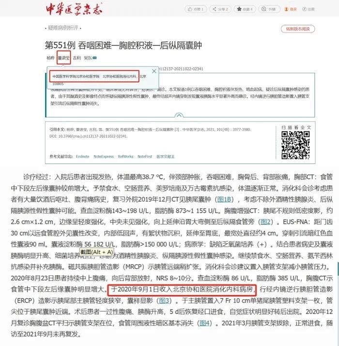 在消化内科方面,2021年,董袭莹作为第二作者,在《中华医学杂志》刊发了一则文章《第551例 吞咽困难—胸腔积液—后纵隔囊肿》。该文章所分析的患者于2020年收入北京协和医院,2021年3月手术完成,当时董袭莹入学仅一年左右。