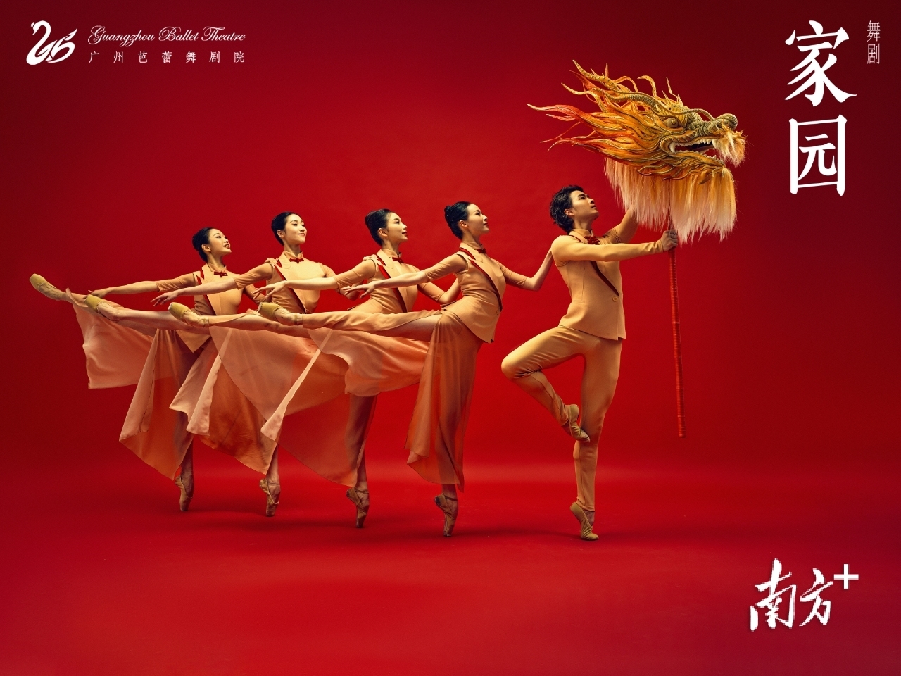 芭蕾舞剧《家园》开场的宽幅式全景,便是以广州地标“小蛮腰”为中心的塔楼建筑群,叠化成烟波浩渺的海湾,海湾中一枚巨大的“水珠”升腾而起,翱翔的“水珠”内不断变幻着大湾区各个城市的名称,下端映现出剧名“家园”两字——一位从大洋彼岸归来的游子,这就是舞剧的男主人公阿辉,他也被浸润在一枚巨大的“水珠”中,“水珠”框构外,各种组合的都市青年掠过,在舞蹈的多重交织中,出现了舞裙分别为正红色、淡紫色、深绿色和浅粉色的“四人舞”,对应着木棉花、紫荆花、荷花以及杜鹃花的拟人化。前三者分别有粤、港、澳的寓意;而杜鹃花则象征着祖国南方漫山遍野的“春意”。