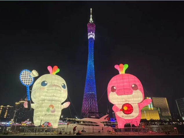 在珠江沿岸,团队打造的高达15米的悬浮吉祥物成为展现广州文化活力与创意风采的都市新符号;在广州塔下,大型彩扎“喜洋洋”骑乘骏马,既寓意“马到成功”的美好祝愿,也象征广州这座千年商都守正创新、奋勇争先的精神气质;在猎德桥畔,6米高的“喜洋洋”与“乐融融”舞动双臂,以灵动姿态传递赛事喜悦与城市热情……