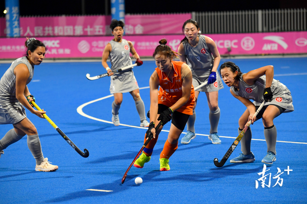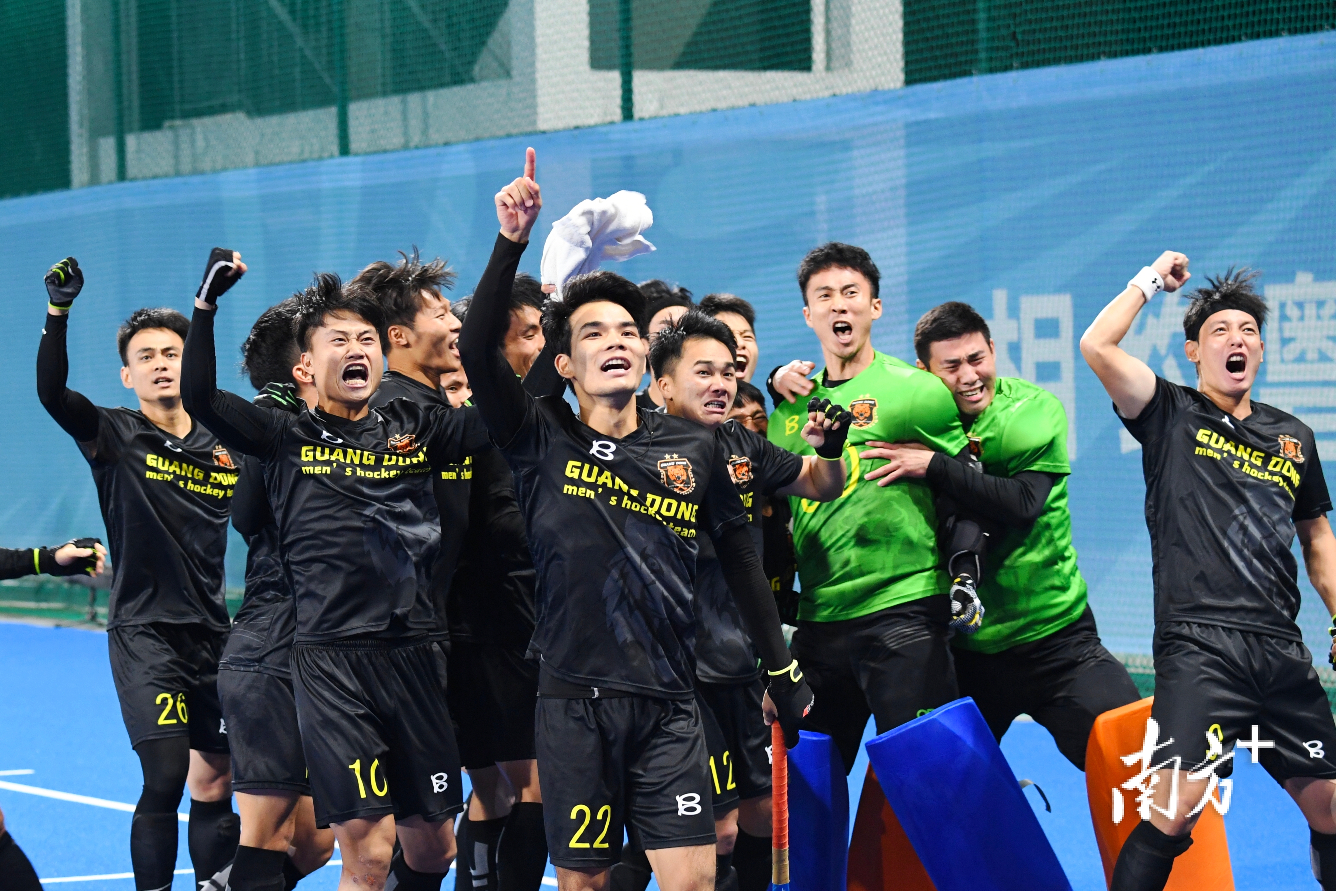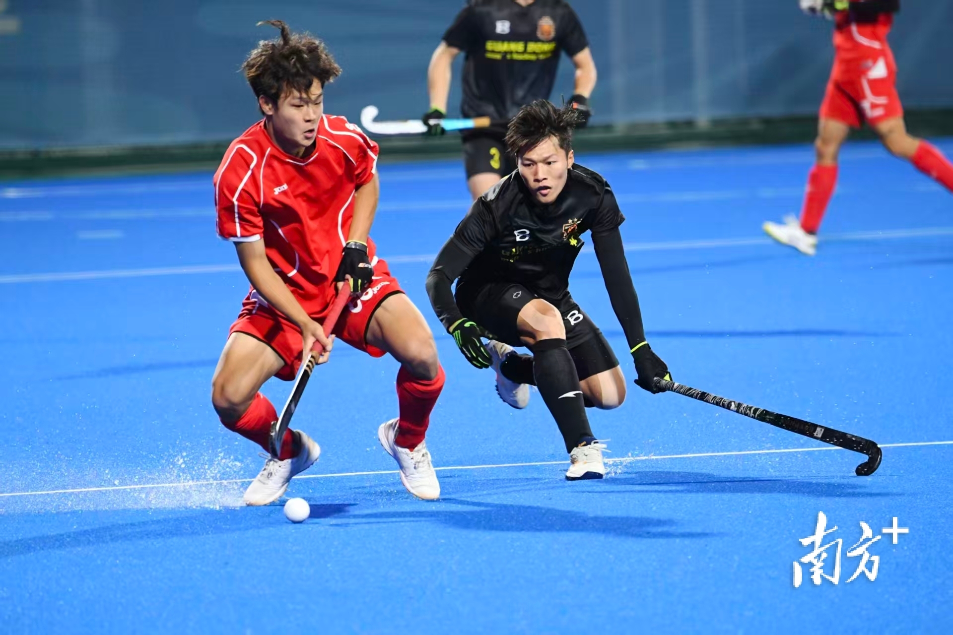 十五运会男子曲棍球昨晚首场半决赛上,广东队(黑衣)在23米球大战中胜出,晋级冠亚军赛。区伟东 摄