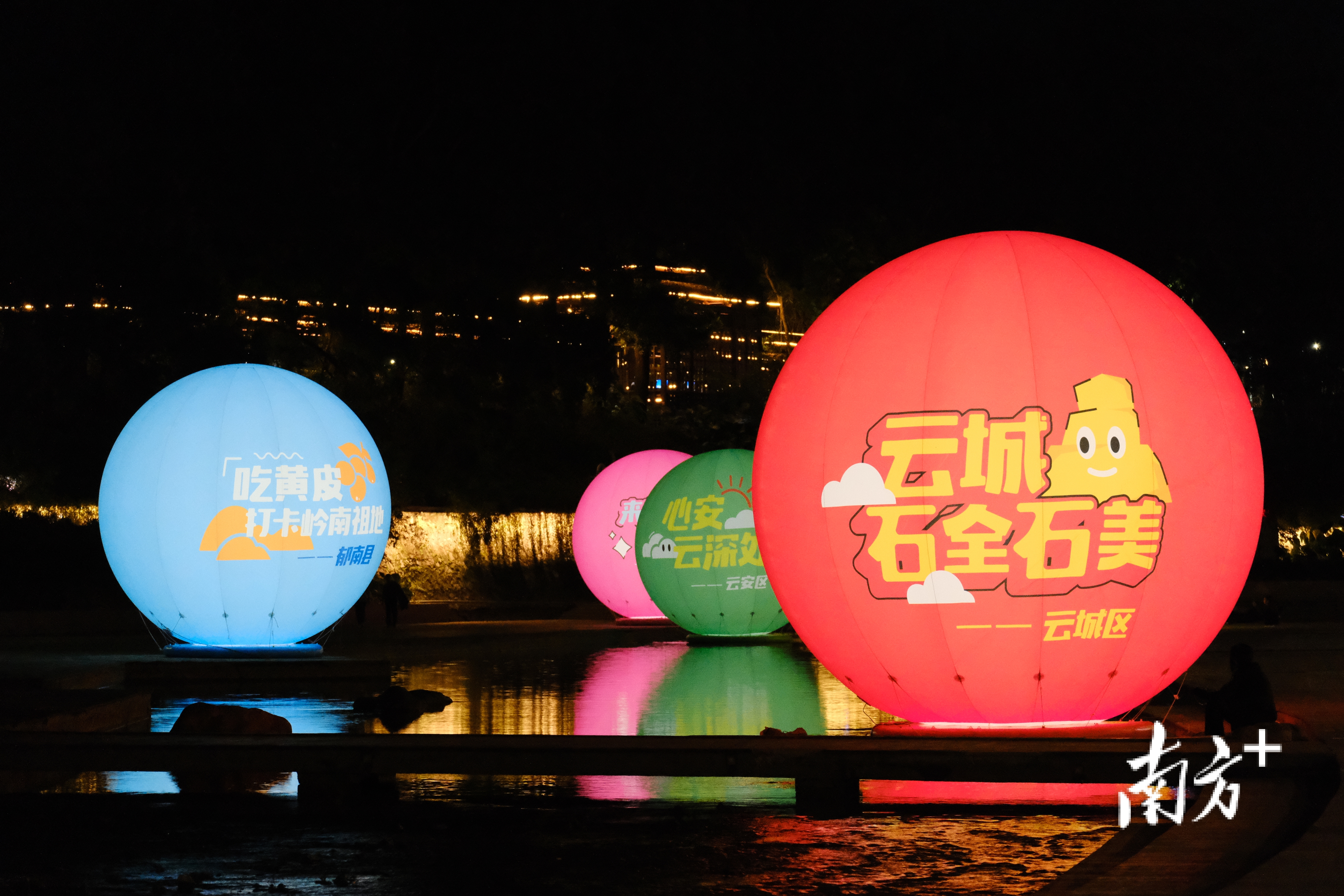 蟠龙天湖的山水光影展,吸引线上线下近50万流量;市体育公园内,“十五运之光”划破夜空,《石乡曲韵》雕塑被灯光映照,云浮特色展位人气高涨,巨型吉祥物成了合照打卡的焦点;吾悦广场、东街等商圈同步展示宣传海报;主干道灯带流光溢彩,中国结灯饰在车流中分外耀眼;南山河亲水平台的小品装置精巧别致,为夜色增添了温度与诗意。