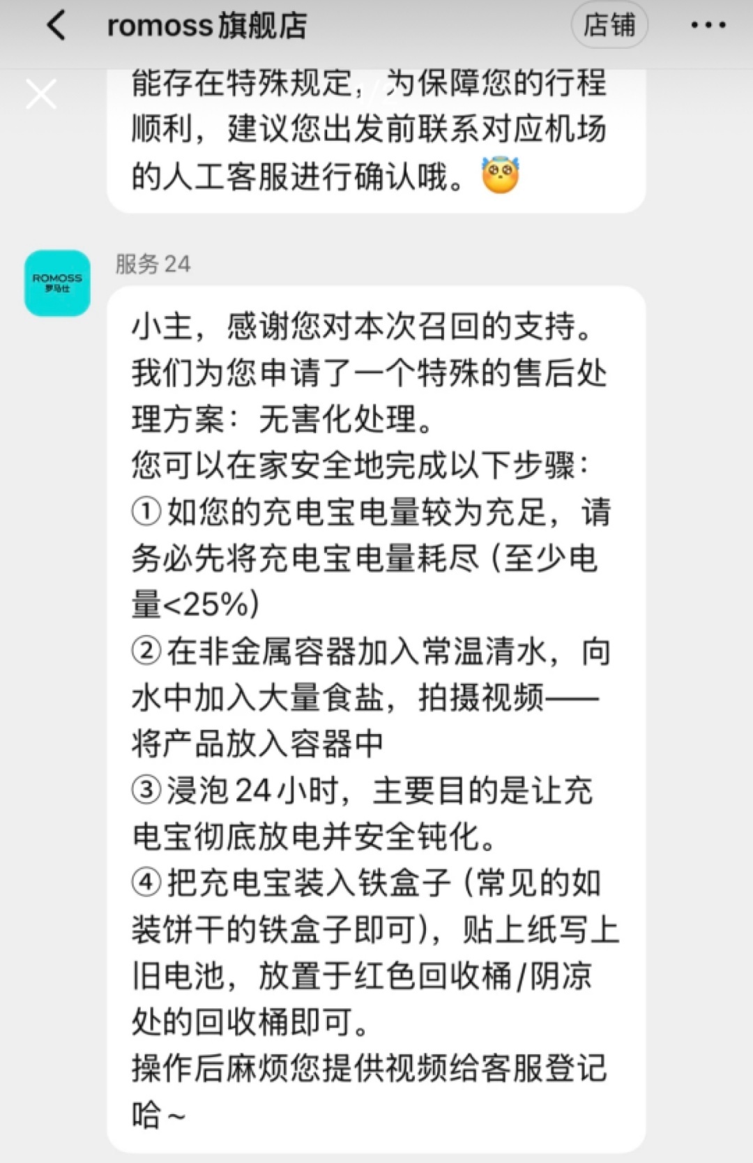 部分快递拒收充电宝,罗马仕淘宝客服提供了由用户自行无害化处理的方案。 |淘宝App截图