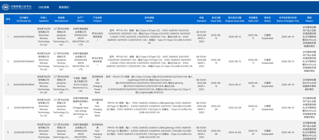 南方周末记者在中国质量认证中心查询发现,2025年以来,不只是罗马仕和安克,其他品牌如倍思、绿联,也有部分充电宝暂停或撤销3C认证,暂停时间从2025年3月至6月不等。