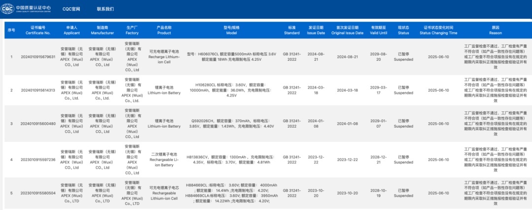 中国质量认证中心网站显示,安普瑞斯有11个电池及电芯产品3C认证证书也处于“暂停”状态,暂停时间均为2025年6月10日,暂停原因为“工厂监督检查不通过、工厂检查有严重不符合项(如产品一致性存在问题等)或工厂检查不符合项报告没有在规定的期限内采取纠正措施报检查组验证并有效”。