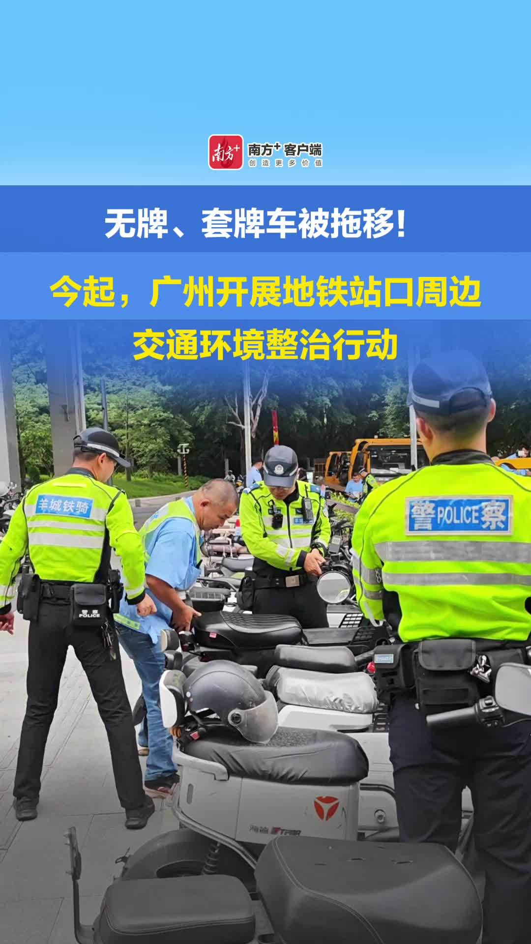 即日起,广州多部门联合对地铁口违停且妨碍通行的车辆予以拖移,对摩电非法营运围堵拉客行为予以打击,对无牌、遮挡号牌、非法改装的电动自行车予以查处,进一步改善地铁口周边交通环境及通行秩序。
