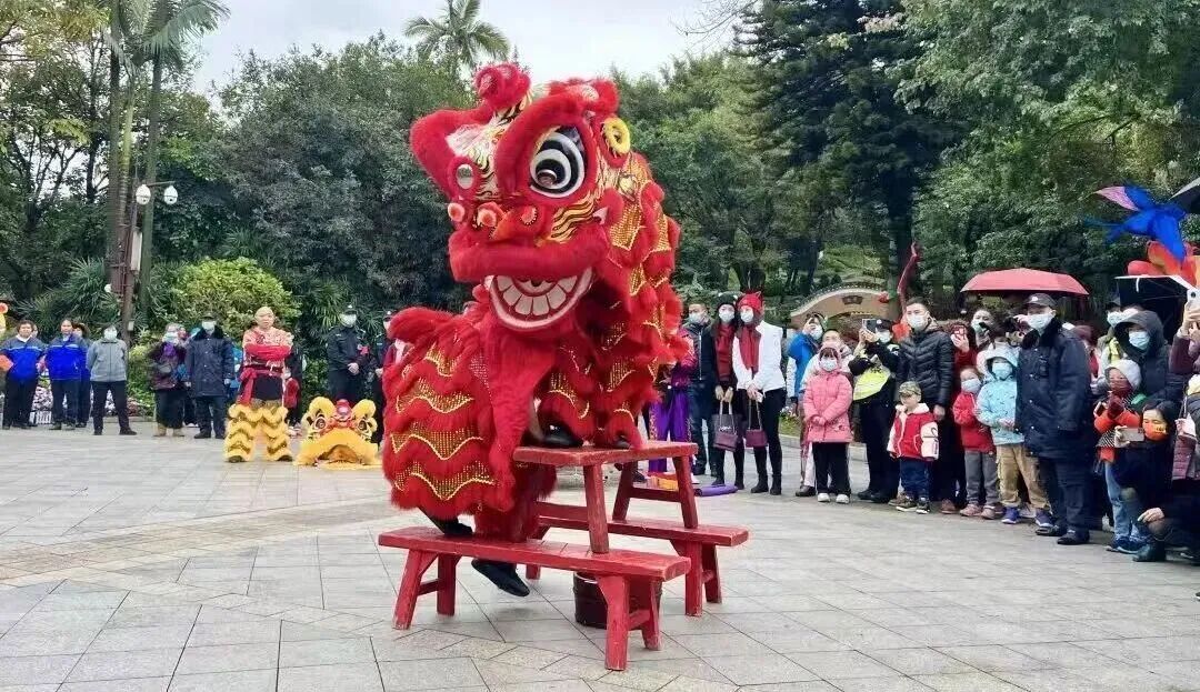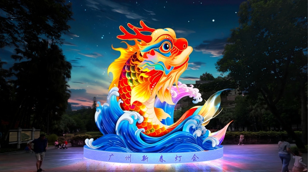 醒狮是广州春节的标配,“采青”“点睛”仪式寓意驱邪纳福。灯组中醒狮跳动的造型传递出广州人“龙马精神”的奋进姿态。