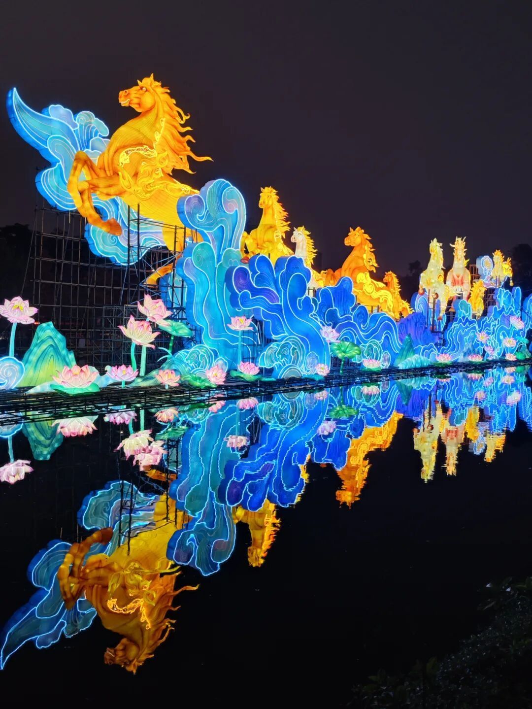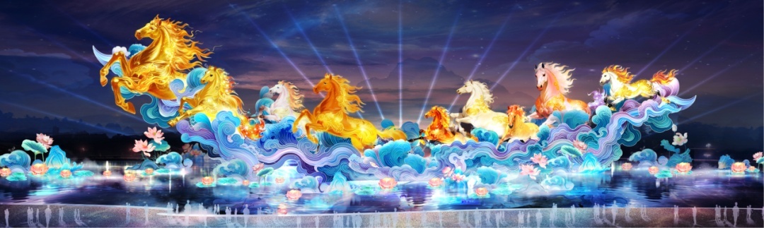如今这忠烈之魂化身灯组,再现“九骏奔腾”的壮阔盛景。骏马昂首嘶鸣,鬃毛翻飞如燃,仿佛跨越百年风雨,以光影为翼,守护着这座城市的精神根脉。灯影流转间,骏马腾跃于绚丽云纹之上,下方莲花水韵波光粼粼,动态光影交织出蹄声阵阵、踏浪而行的雄奇图景,尽显“马跃山河、气贯长虹”的豪迈。