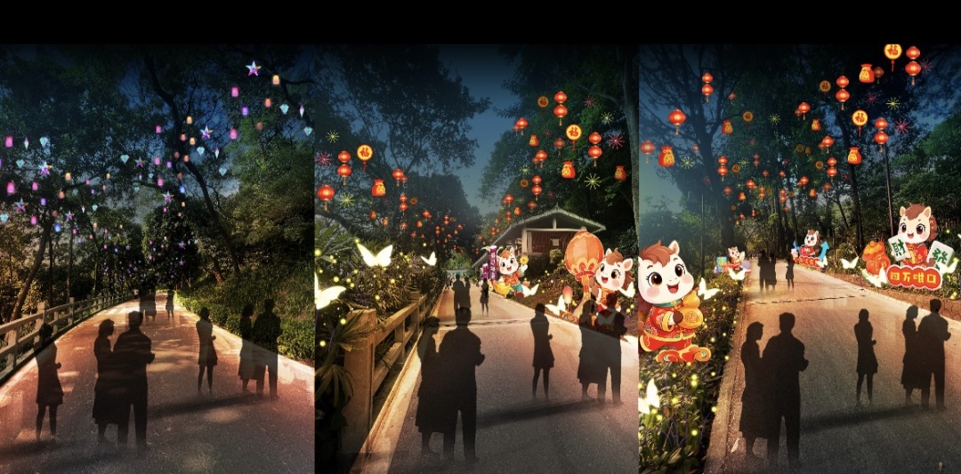 从陌上花开到金印顶,全长800米的《新春祝福》灯组,萌趣生肖马形象一路相伴。