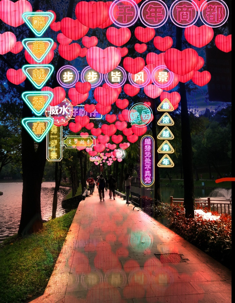 《爱漾越秀》:60米长的爱心挂件灯带,搭配特色标语,营造浪漫氛围,和爱人一起走过,新的一年甜甜蜜蜜。