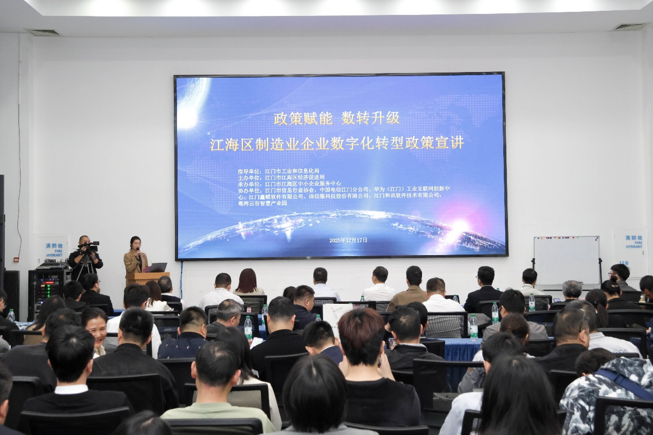 数字化转型已成为中小企业立足市场的 “必修课”,而资金少、人才缺、抗风险能力弱的痛点,让企业转型望而却步。近日,由江门市工业和信息化局指导、江海区经济促进局主办的 “江海区制造业企业数字化转型政策宣讲会” 在粤湾云谷智慧产业园举行,中国电信江门分公司作为协办单位,深度参与并为企业带来数智赋能方案,助力企业把握转型窗口期。