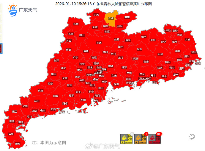 此外,10日下午,广东气象部门提醒,当前,天气持续晴朗干燥,12-15时,广东大部相对湿度均跌至30%左右,梅州个别市县还跌破20%,全省几乎所有县区均发布森林火险红色预警,高火险天气极易引发森林火灾。请广大市民群众积极配合,进山不带火、入林不吸烟,严格火源管控,不因一时疏忽大意引发山火。