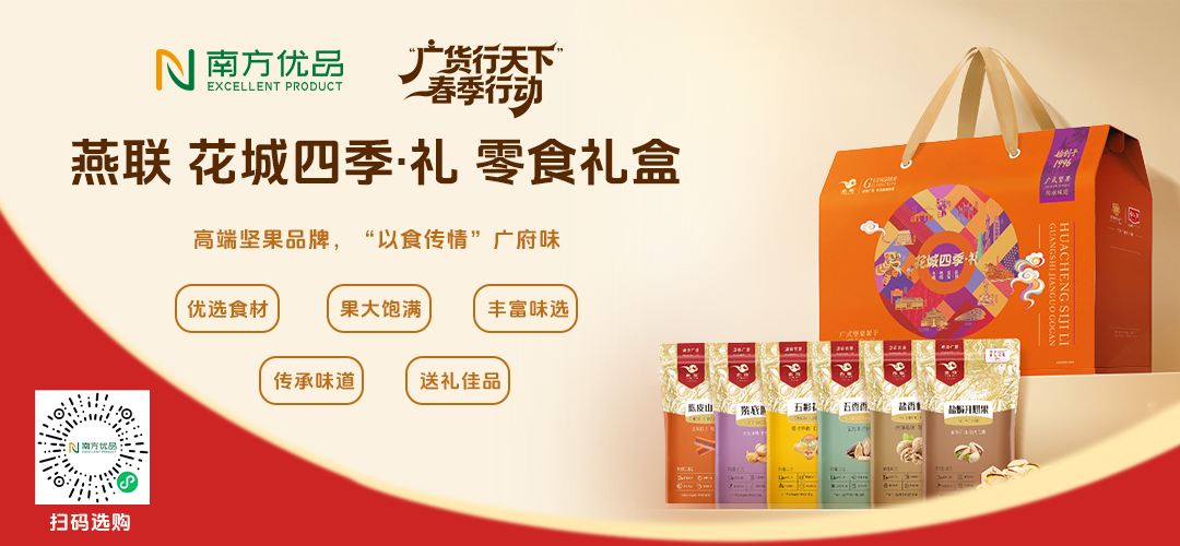 广货行天下,燕联深入原料产地,甄选当季优质坚果,推出“花城四季”坚果礼盒,以十二道品控工序确保颗颗酥脆好味,包装设计融合广府文化元素,用高品质、高颜值,礼遇吉祥。