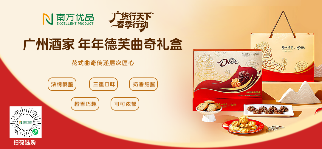 近年来,广州酒家玩转跨界创新,携手德芙推出“年年得福”曲奇礼盒。内含三种口味:经典黄油曲奇奶香绵长,巧克力曲奇醇厚回甘,橙皮曲奇则在酥脆中添上一丝清新果香。中西风味交融,传递出“甜甜蜜蜜,福气连连”的新春祝愿。此次跨界联名,既保留传统风味,又融入新颖创意,诠释出“广货”包容万象、兼容并蓄的岭南气度。