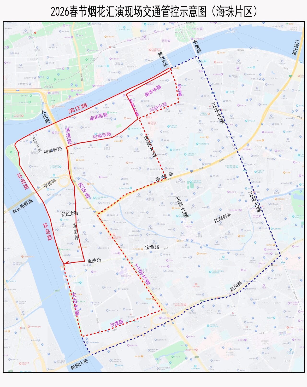 (二)2026年2月17日15:00至活动结束,对黄沙大道(不含,华誉一街路口至御景1号门口段)、誉江路、华誉一街合围区域,人民桥东西侧便道(西堤二马路至沿江西路)、新基路、靖远路、新堤三横路、新堤一横路、沿江路(解放路至白天鹅宾馆引桥口)等区域(路段)实施临时交通管理措施。