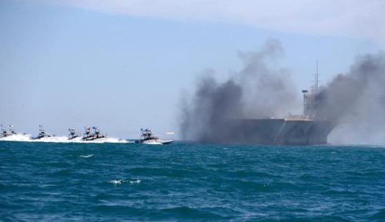 资料图:当地时间2015年2月25日,伊朗南部霍尔木兹海峡,伊朗伊斯兰革命卫队于霍尔木兹海峡举行军事演习。