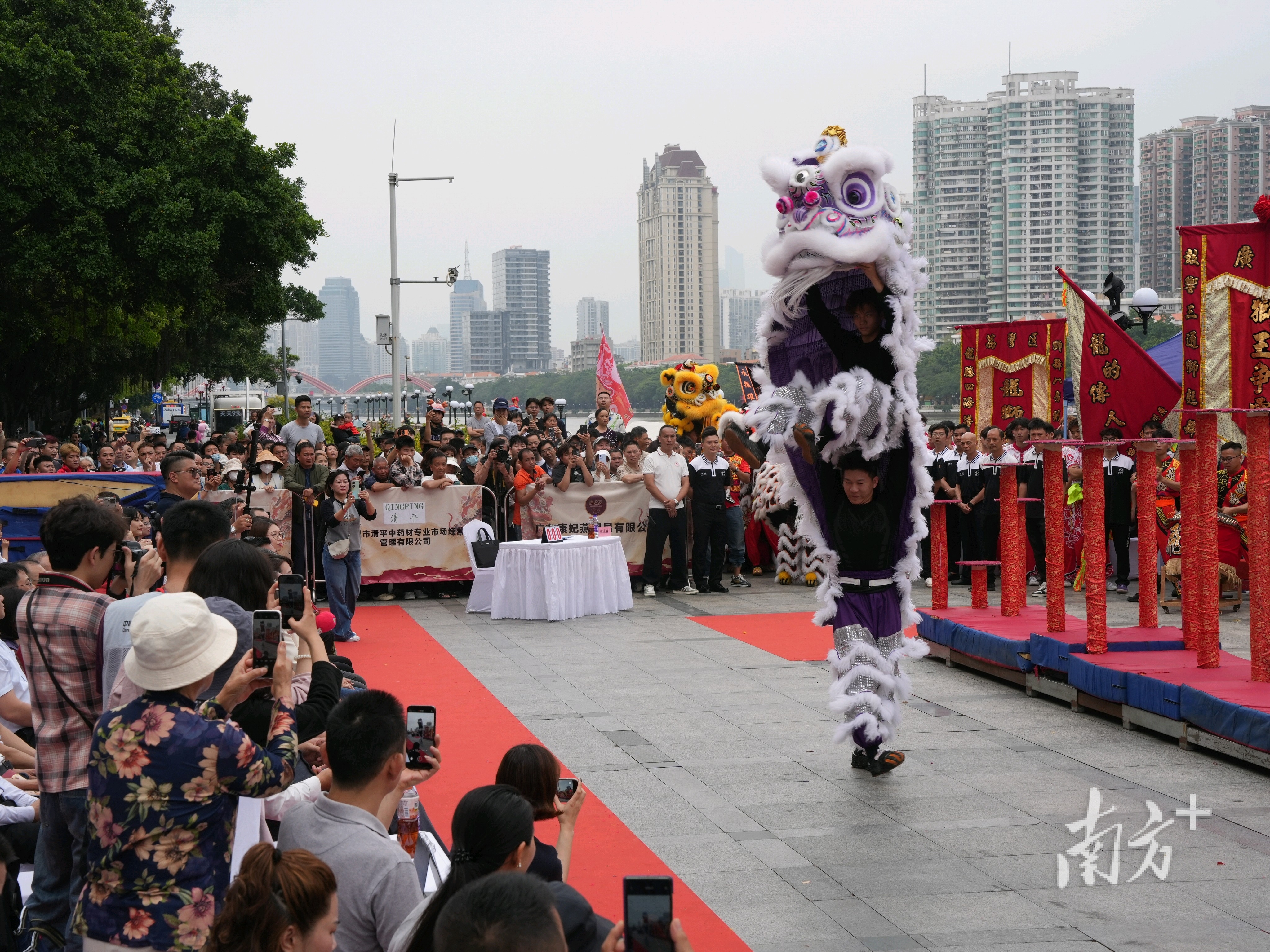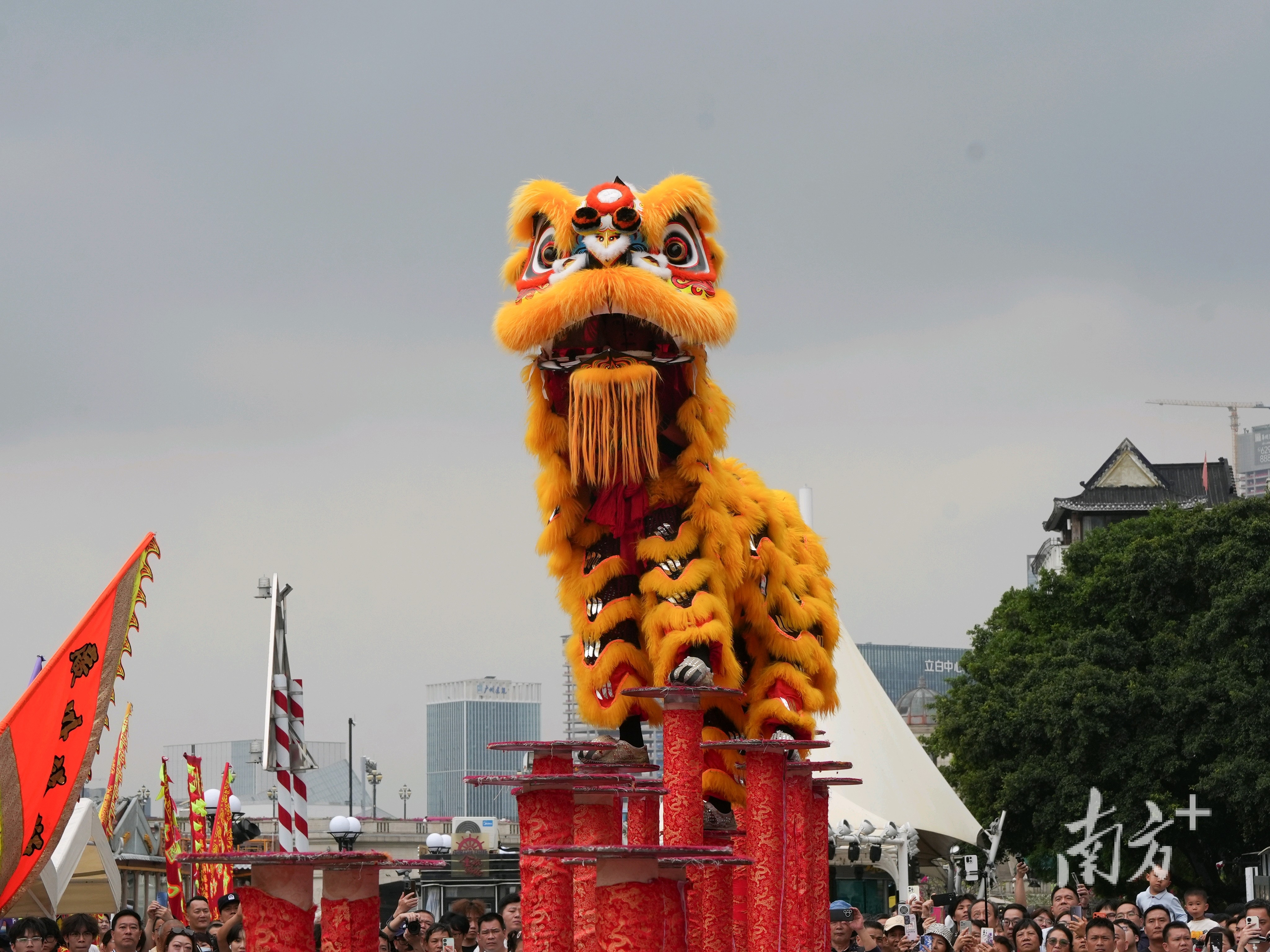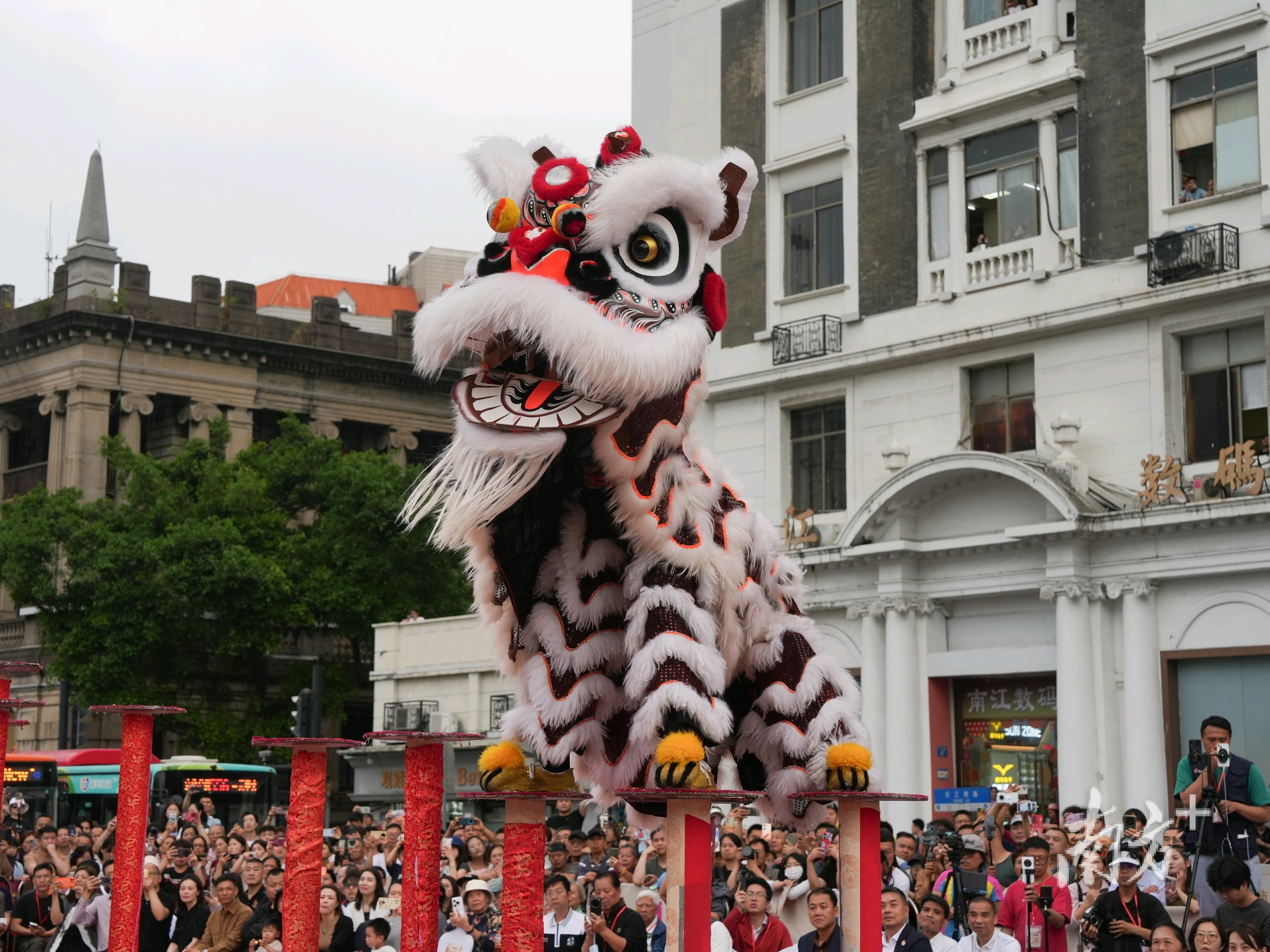 活动当天,来自两广8支曾斩获国内外金奖的顶尖队伍各展绝技,在高桩上腾挪跳跃、辗转腾移,尽显醒狮技艺的独特魅力。桩上雄狮时而昂首探路,时而俯身采青,忽然凌空跃起,稳稳地落在高桩上,瞬间掌声雷动,喝彩如潮。