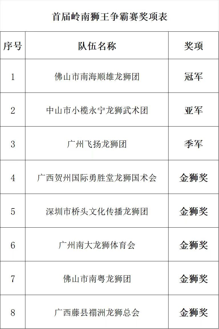 最终佛山市南海顺雄龙狮团斩获冠军、中山市小榄永宁龙狮武术团斩获亚军、广州飞扬龙狮团斩获季军以及广西贺州国际勇胜堂龙狮国术会等队伍斩获金狮奖。