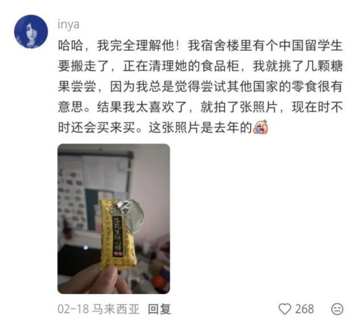 “甜蜜接力”形成闭环,并且持续输出新甜蜜!评论区还有马来西亚网友跟帖,被中国留学生“种草”酥心糖的过程。