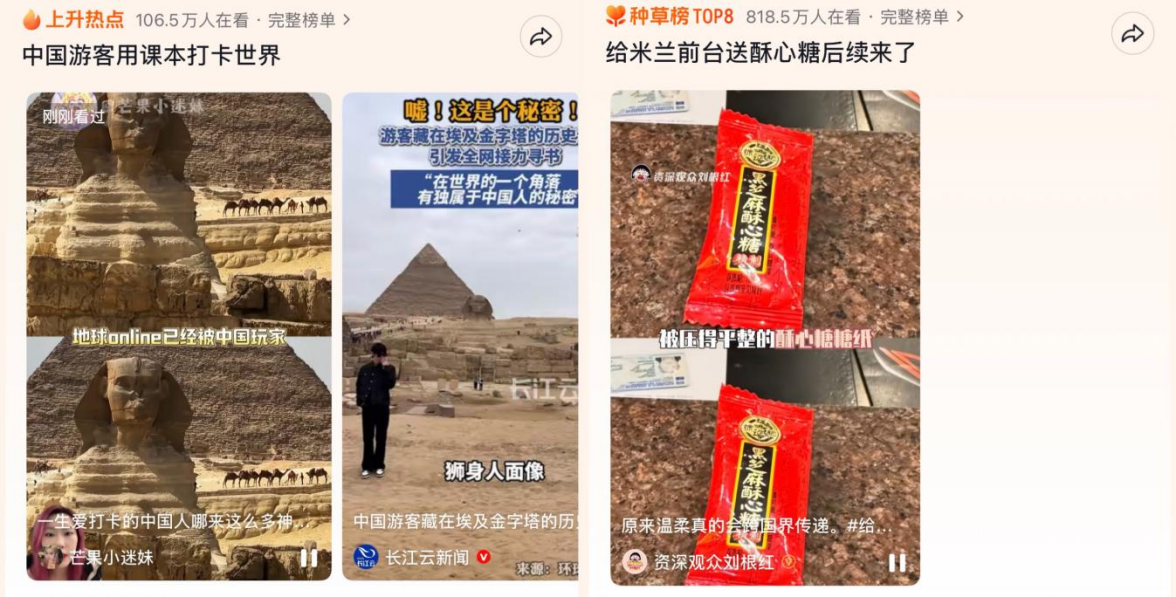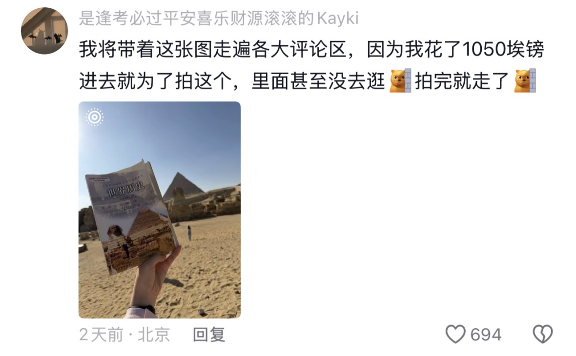 有人在金字塔旁翻出九年级历史书,和课本封面“原景合影”,拍完再藏回去,等下一位中国游客接力;于是新的话题是:埃及的历史书已经“泛滥”了!
