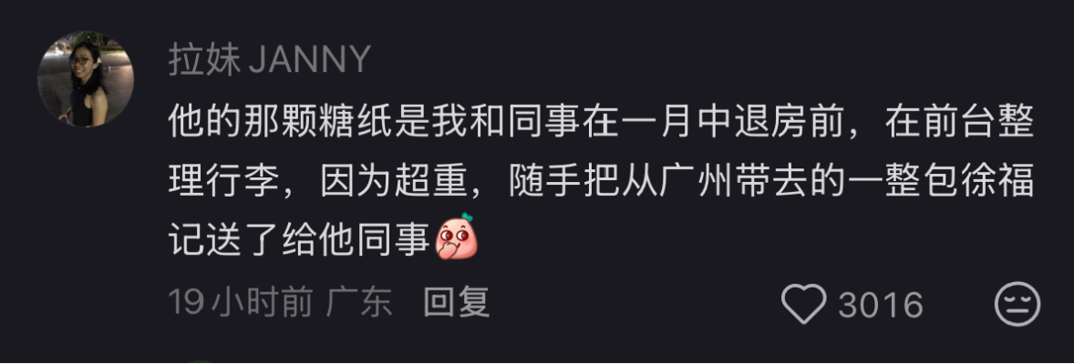 奇妙的是,伟大的互联网还让这张糖纸的“最初故事”呈现。网友@拉妹JANNY在评论区留言:“他的那颗糖纸是我和同事在一月中退房前,在前台整理行李,因为超重,随手把从广州带去的一整包徐福记送了给他同事。”