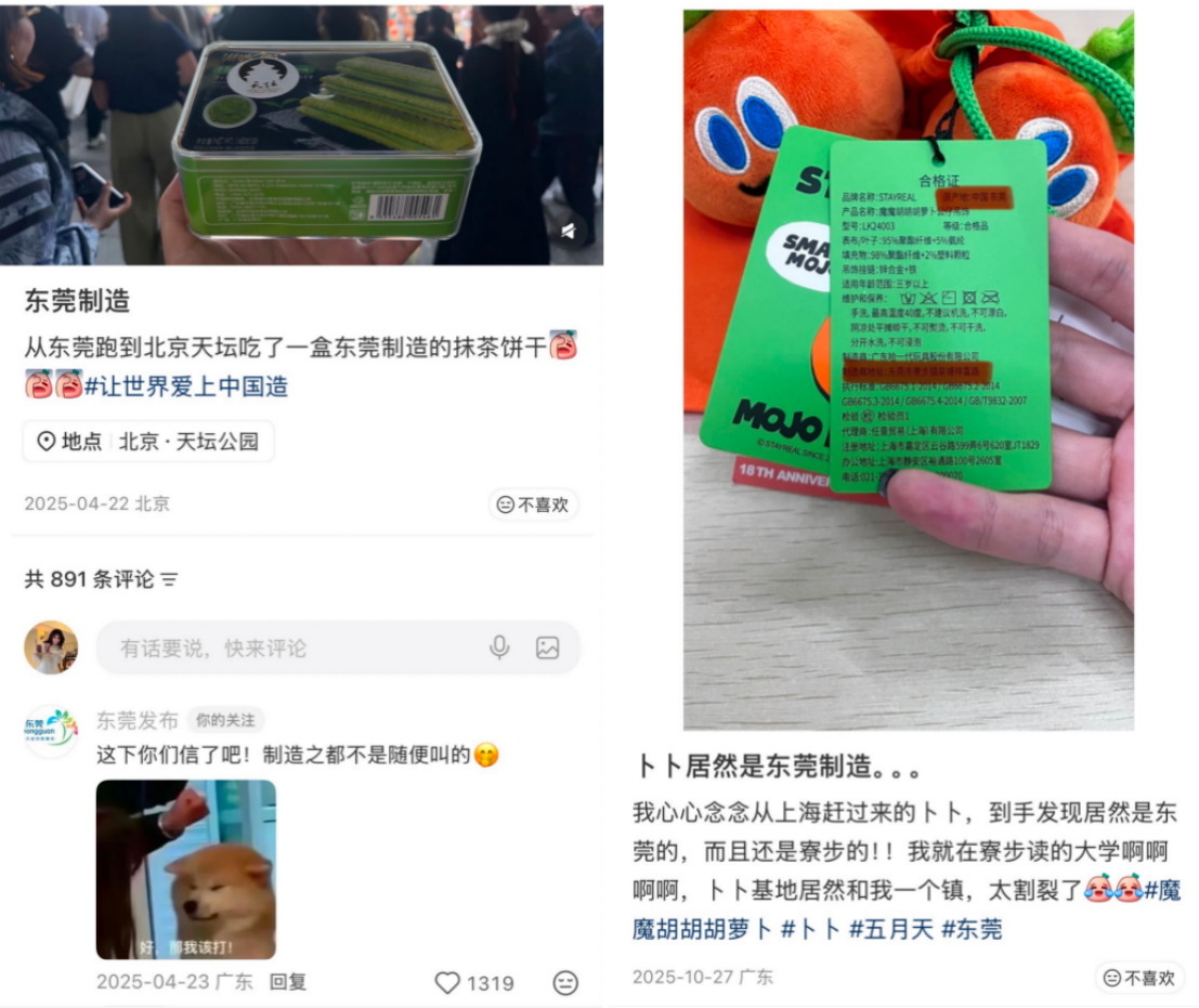 在北京天坛吃到的抹茶饼干,在上海迪士尼买到的玩偶公仔,甚至五月天巡演抢手的“魔魔胡胡胡萝卜”周边,翻看标签,都可能发现“东莞制造”的字样。