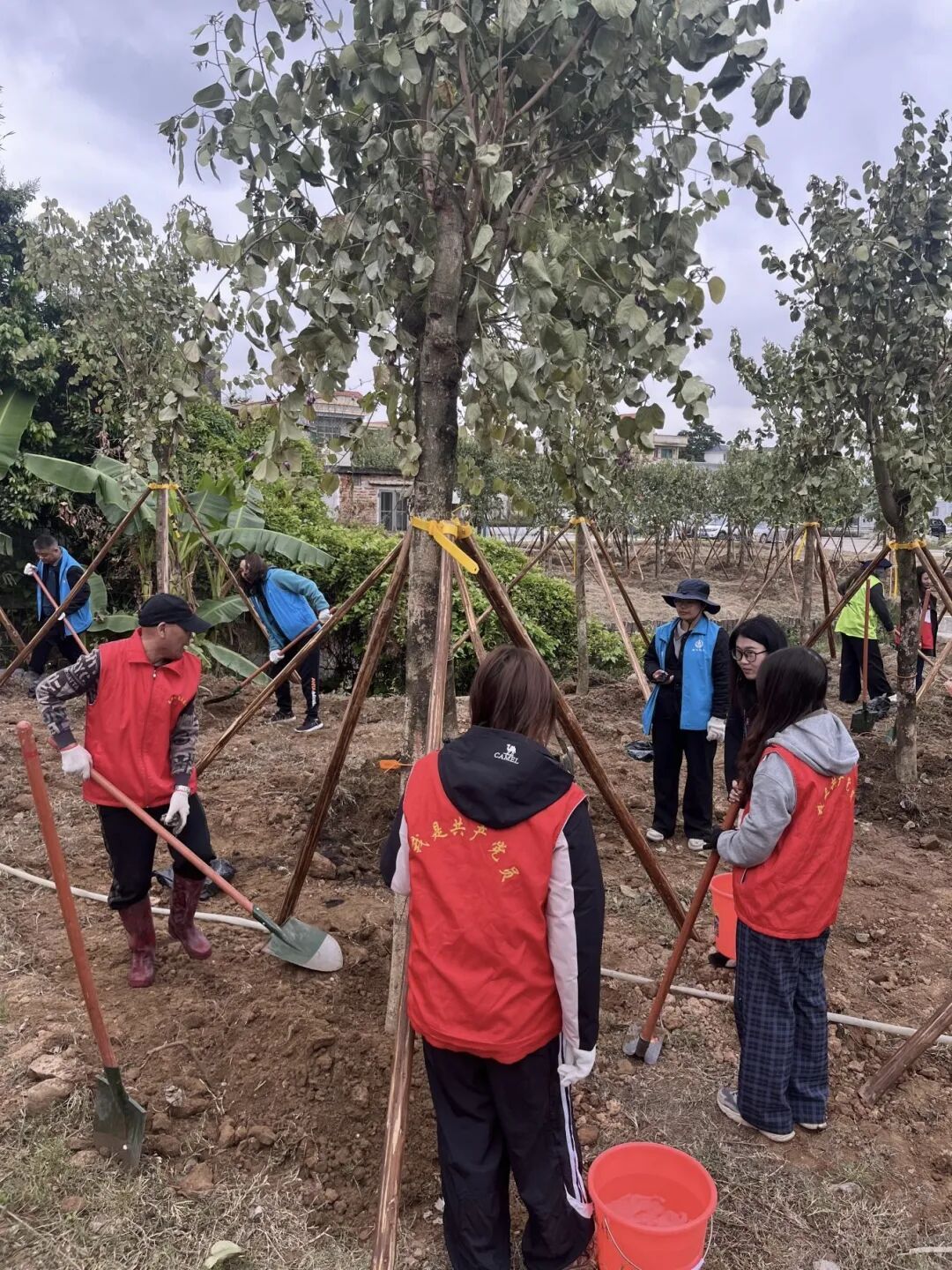 植树现场一派热火朝天的劳动景象,大家三五人一组,分工协作,配合默契,纷纷挥锹铲土、扶苗填坑、踏土夯苗、提桶浇水,每一道工序都做得认真细致、一丝不苟。大家一边植树,一边交流着苗木品种、生长习性及后期管护知识,现场气氛热烈融洽,一棵棵翠绿的宫粉紫荆树与忙碌的“红马甲”交相辉映,构成了一道亮丽的风景线。经过一上午的辛勤劳作,原本空旷的土地上,新栽下的350株宫粉紫荆迎风挺立、错落有致,焕发出勃勃生机。