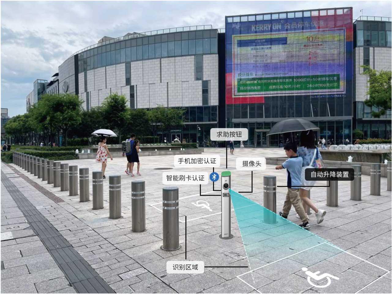 华途开发的无障碍升降桩。我们现在运用新技术也是这个思路,比如一些场地外围设置的智能升降桩,正常情况下识别到路人推行轮椅后,会自动降下桩体,但受限于技术水平、现场环境,它不一定能准确识别婴儿车,我们就会提供人工介入的渠道,比如设置一个按钮,有需求者按了按钮,后台工作人员确认无误后,就可以降下桩体了。