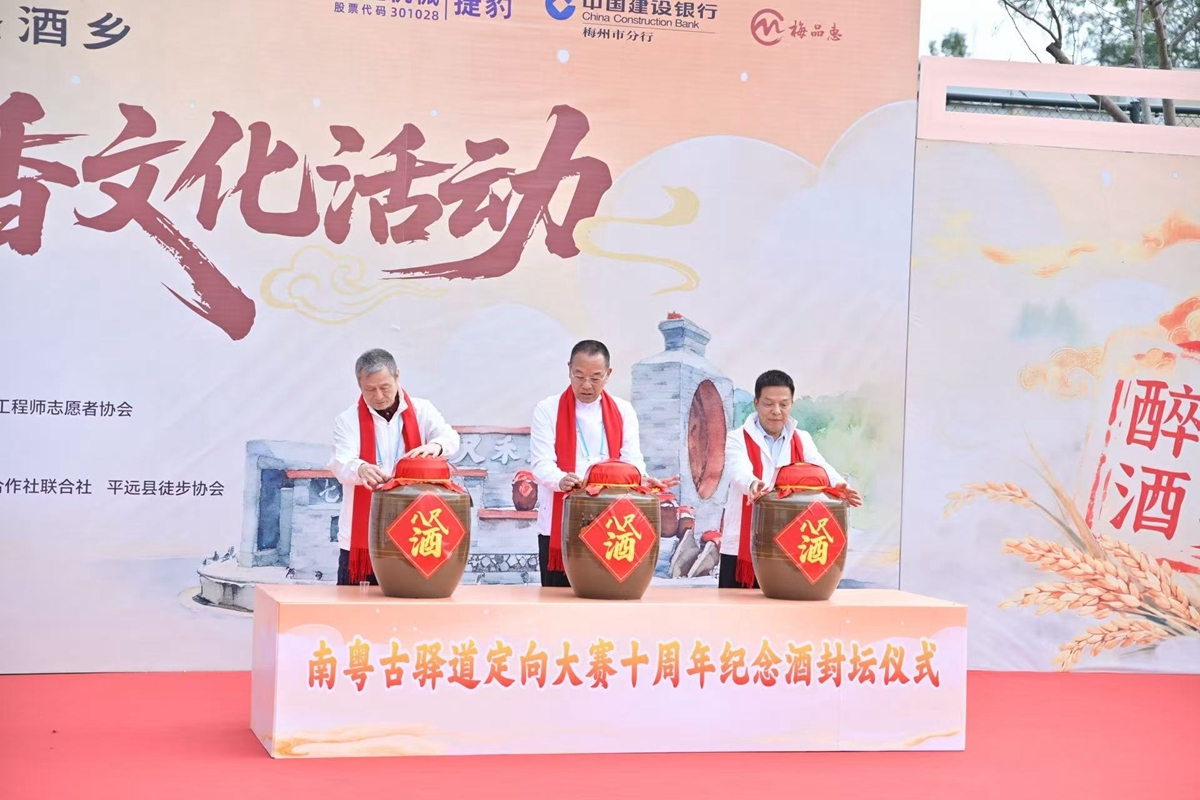 活动现场首先举行了南粤古驿道定向大赛10周年纪念酒封坛仪式。厦门东亚机械工业股份有限公司董事长韩莹焕、广东省酒类行业协会会长彭洪、广东省户外运动协会荣誉副会长刘鹏,共同上台将3坛100斤装的纪念酒封存。3坛美酒,承载着南粤古驿道定向大赛十年的发展记忆,也寄托着平远县八尺酒产业的未来期许,仪式结束后,美酒将被存入八尺镇博物馆。