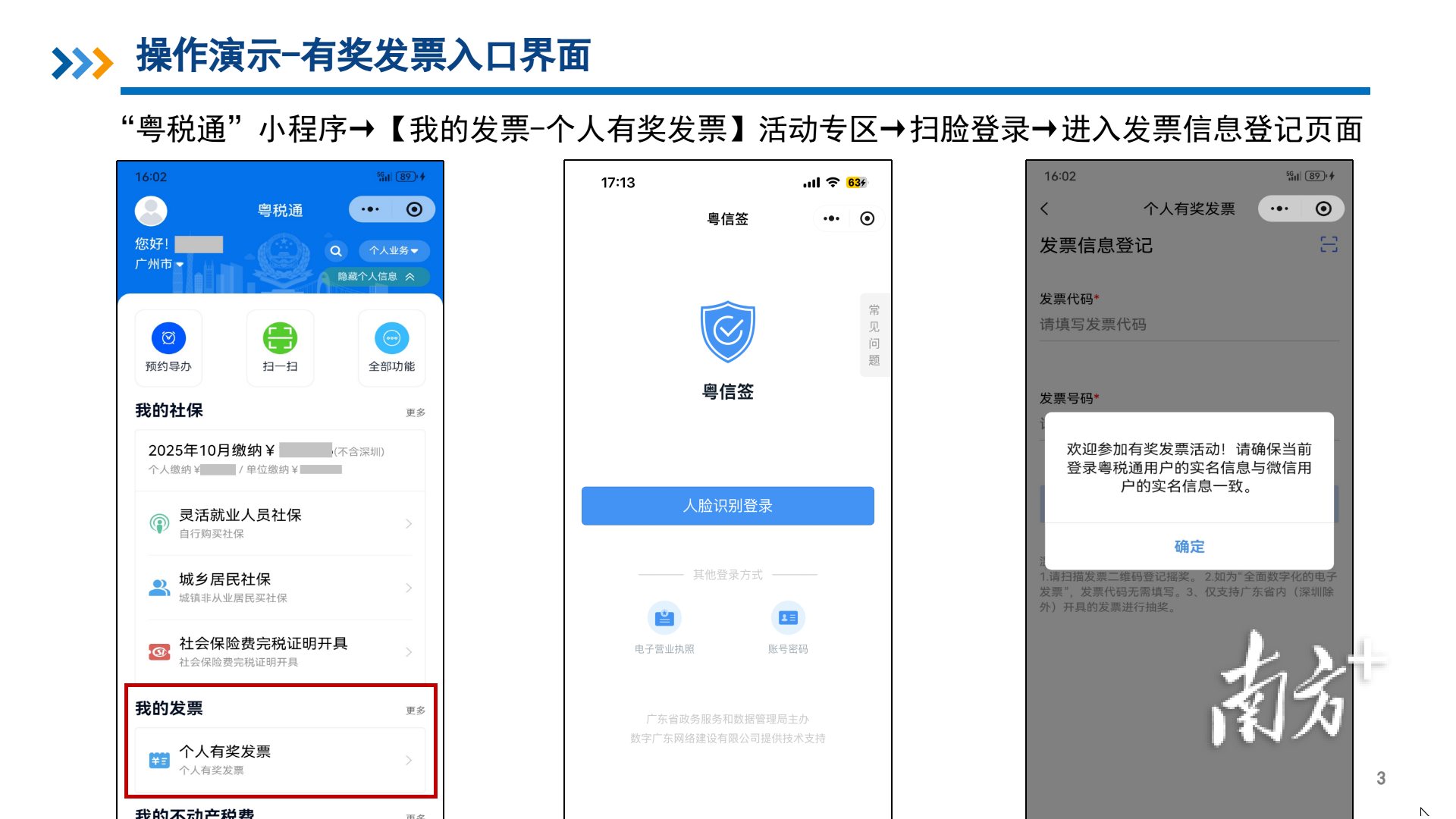 取得符合条件的发票后,个人消费者可登录“粤税通”小程序,进入【我的发票-个人有奖发票】活动专区,扫描发票二维码或手工录入发票相关信息,登记参与“发票抽奖”活动。