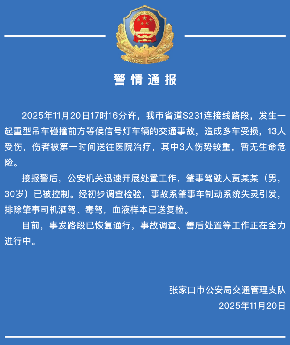 2025年11月20日17时16分许,我市省道S231连接线路段,发生一起重型吊车碰撞前方等候信号灯车辆的交通事故,造成多车受损,13人受伤,伤者被第一时间送往医院治疗,其中3人伤势较重,暂无生命危险。