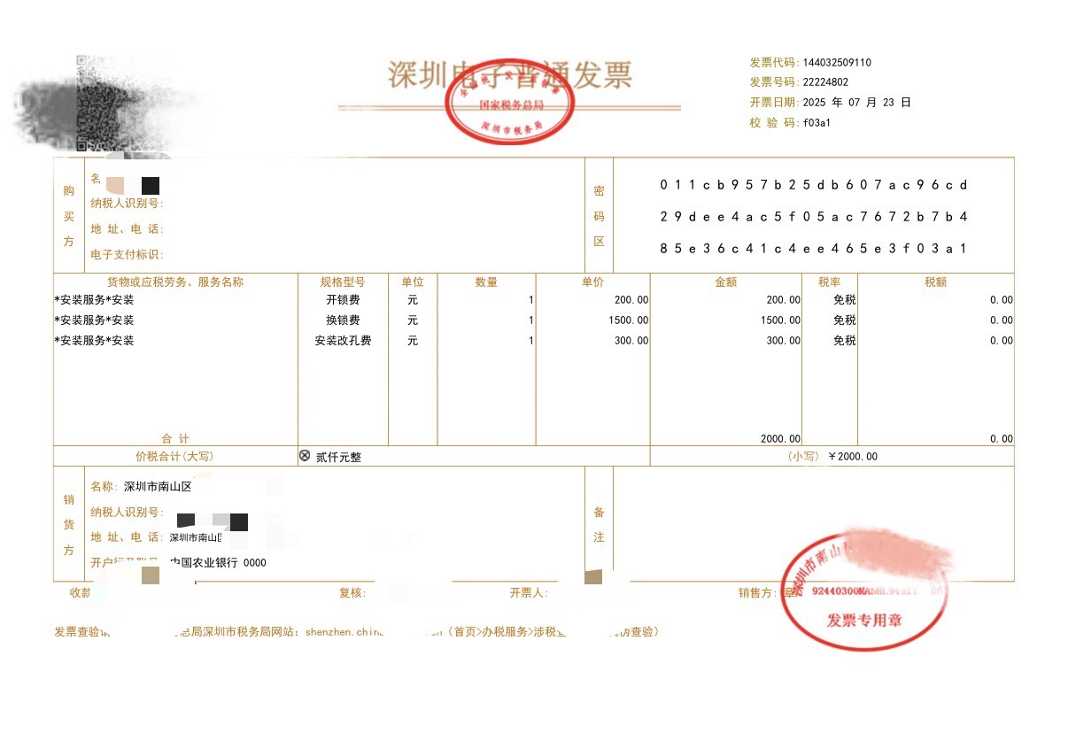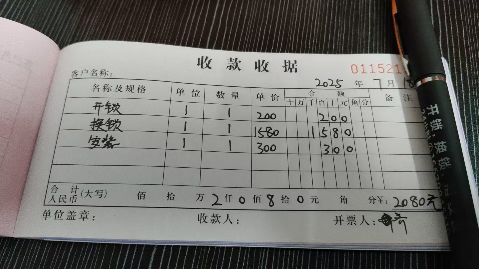 反应过来是遭遇了消费侵权后,丹丹和室友着手收集证据,找师傅要到了费用收据,并根据师傅的手写收据找商家拿到了一张发票。记者注意到,发票上清晰呈现的收费项目分别是:开锁费200元,换锁费1500元,安装改孔费300元。